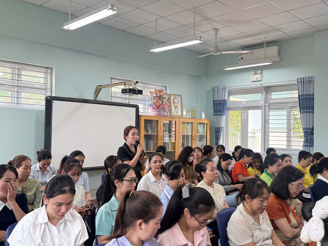 Cô Hiệu trưởng báo cáo chuyên đề và thảo luận chia sẻ chuyên môn.